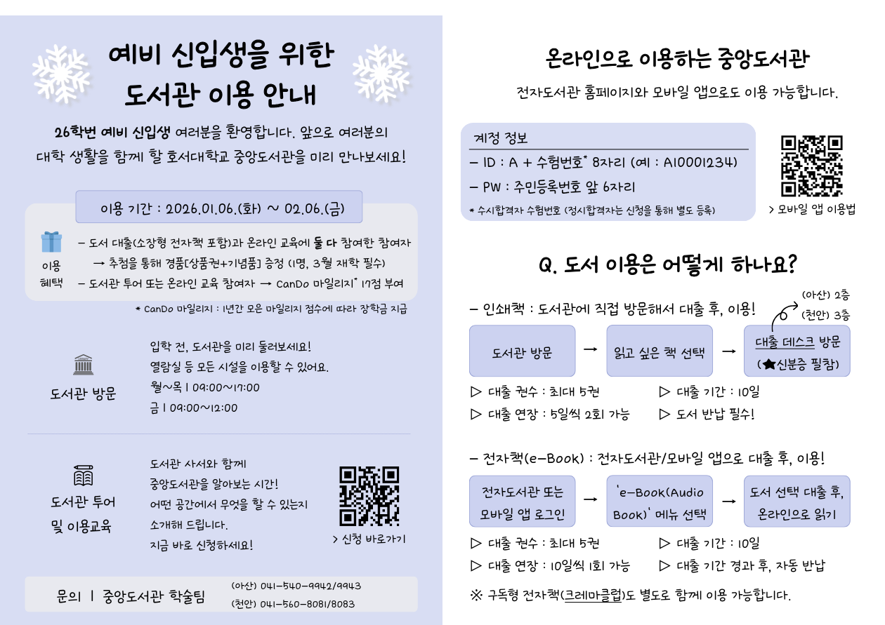 [도서관] 26학번 예비 신입생을 위한 도서관 이용 안내 : 26학번 신입생 여러분을 환영합니다~* 작성자 생명공학과 등록일자 2026-01-07 조회수 63 PRINT 내용 ■ 도서관 투어 및 이용교육 신청 바로가기 (투어 및 교육 당일 오전 10시 신청 마감 후, 안내 문자 발송)■ 도서관 모바일앱도 있어요! 지금 바로 앱스토어/플레이스토어에서 '호서대학교 도서관'을 다운로드해서 이용해보세요😊 ※ 소장형 전자책 이용방법 숏츠 바로가기 ※ 구독형 전자책 (크레마 클럽) 이용 공지 바로가기